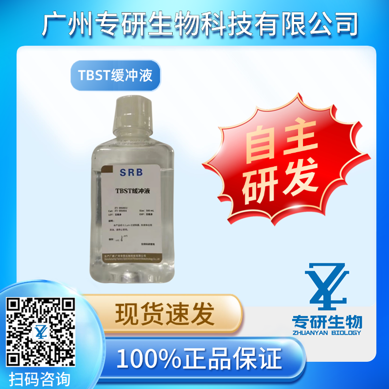 TBST 缓冲液是生物学中常使用的等渗缓冲盐溶液,主要用于 Western Blot 实验中洗去膜上非特异性结合的抗体等试剂。由 Tris-HCl 构成稳定的 PH 缓冲体系,NaCl 提供等渗条件,Tween-20作为去污剂可增加缓冲液的洗脱能力。本产品为 1×工作液,可直接使用,用后请及时拧紧瓶盖,以防挥发。4℃保存可延长产品保质期,长期不用建议低温保存。若产品出现结晶析出,请置于 37℃水浴至完全溶解。