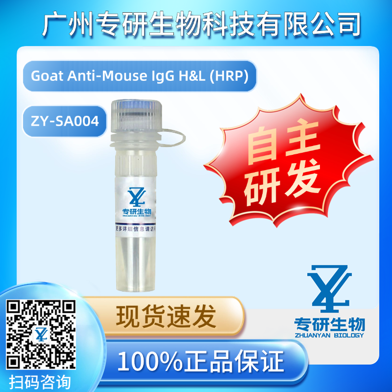 本山羊抗小鼠 IgG-HRP 为进口分装。规格: 200μl(100μl 标记抗体+100μl 甘油)特异性: 经免疫电泳分析,此抗体可以与小鼠 IgG 反应,亦可和小鼠的其他免疫球蛋白轻链反应,与非免疫球蛋白的血清蛋白不反应,但与其他种属的免疫球蛋白可有交叉反应。稀释范围:ELISA 或 WB:1:2,500-50,000,现用现配。稀释液: 0.01M 的 PBS 或 TBS 缓冲液,pH7.2~7.6(稀释液中不能含叠氮钠成分)。