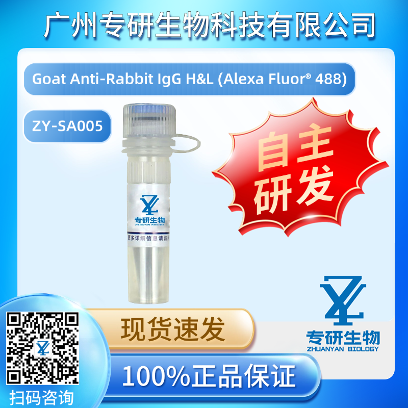 规格:原装进口为1.5mg 进口分装为0.1ml(含50%甘油)浓度:0.75mg/ml稀释范围:1:100 - 1:800 for most applications荧光素:Alexa Fluor 488 carboxylic acid, Amax=493, Emax=519缓冲液:0.01M的磷酸钠、0.25M的NaCl、pH 7.6稳定剂:15mg/ml牛血清白蛋白(不含IgG和蛋白酶)防腐剂:0.05%叠氮化钠分装及储存:1、在进口原装抗体分装时,加入50%灭菌的甘油,能延长试剂的保存期。但应注意的是,此时抗体的浓度及稀释比例应降低一倍。2、初次使用参考推荐的稀释比例,实际实验操作过程中需根据抗原和抗体的具体情况适当调节二抗的稀释比例。但应注意,需现用现配,因为稀释后抗体的有效活性会很快降低。3、-20℃保存,避免反复冻融。4、本产品仅限于专业人员的科学研究用,不得用于临床诊断或治疗,不得用于食品或药品。5、为了您的安全和健康,请穿实验服并戴一次性手套操作。保存条件:-20℃避光保存,有效期一年。