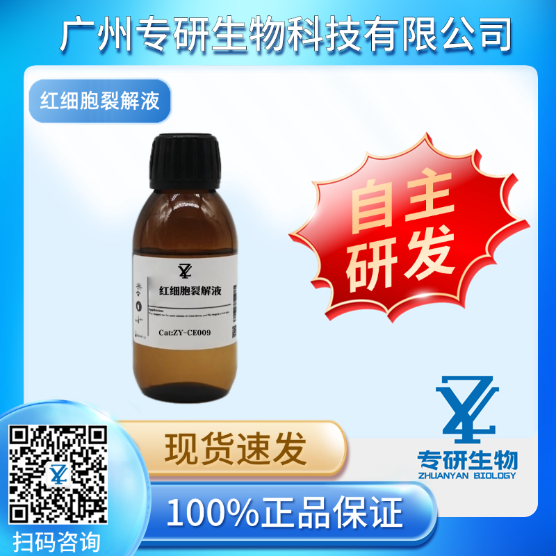 红细胞裂解液是一种用于从人或鼠等的血液或组织样品中裂解并去除无细胞核红细胞的溶液。经过优化配方,在裂解红细胞的同时几乎不损伤淋巴细胞(lymphocyte)或其它有细胞核的细胞。主要有效成分为氯化铵。不适用于有细胞核红细胞的裂解,例如鸟或禽类的红细胞。本产品已过滤处理,溶液为澄清透明溶液。如果要使用该产品处理过的血液或组织细胞样品用于后续的原代培养、细胞融合等细胞培养实验,建议客户将本产品通过 0.22μm 滤膜过滤后使用。如果使用该产品处理的样品进行核酸或蛋白提取及常规分析测试,可以直接使用该产品。